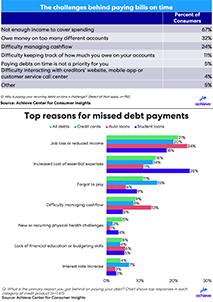 Achieve’s survey found 38% of consumers said it’s “Very Difficult” or “Difficult” to pay all of their bills on time, up from 35% last quarter. Among these consumers, 67% said their income isn’t enough to cover their spending, while 32% said they owe money on too many accounts to keep up.